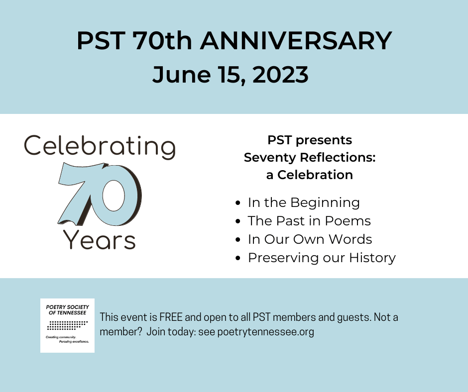 On June 15, 2023, the Poetry Society of Tennessee (PST) will hold a virtual celebration from 7:30-9:30 pm Eastern / 6:30-8:30 Central in honor of its 70th anniversary.