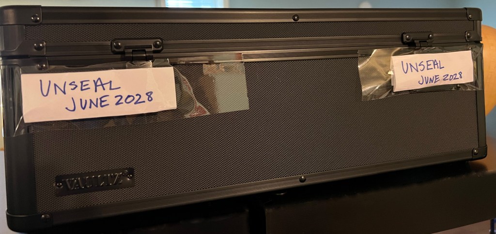 The evening concluded with a time capsule ceremony. Lisa Kamolnick presented and accepted various documents and artifacts and placed them in the PST time capsule, a heavy duty black case with dual combination locks. By unanimous decision in the only official business of the evening, the society heard a motion and approved that the time capsule hold said items, remain open through June 18, 2023, for any as-yet provided poetry from the poetry share, be sealed on June 19, 2023, not to be opened again until June 2028. The items placed in the physical time capsule have been digitized and placed in a digital time capsule as well.