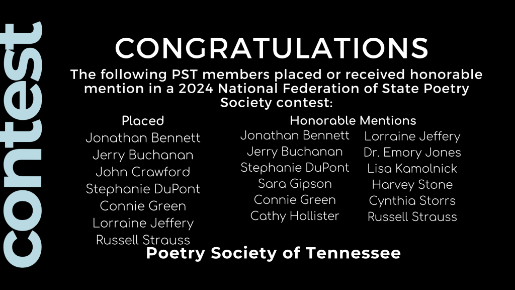 We enjoyed top poets competing in the BlackBerry Peach Poetry Slam and selections from manuscript and spoken word contest winners. A youth poetry workshop and slam were also held. While at the convention, I especially enjoyed meeting our members Russell Strauss, Cynthia Storrs, and Cathy Hollister. After meeting with other state society members (another pleasure), I feel even more strongly that our collaboration can advance poetry here in Tennessee and … everywhere.