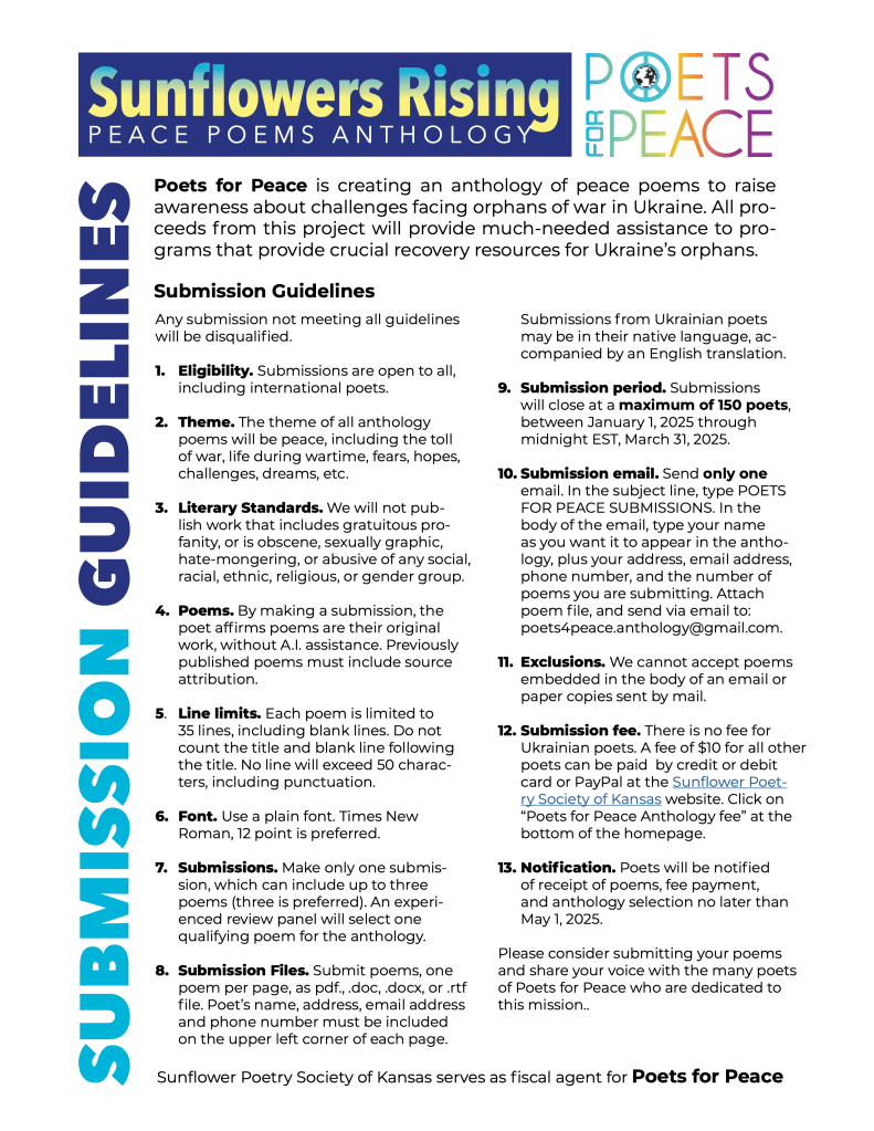 Poets for Peace Call for Submissions through March 31, 2025. Enter soon: submissions will close once 150 poets have submitted.