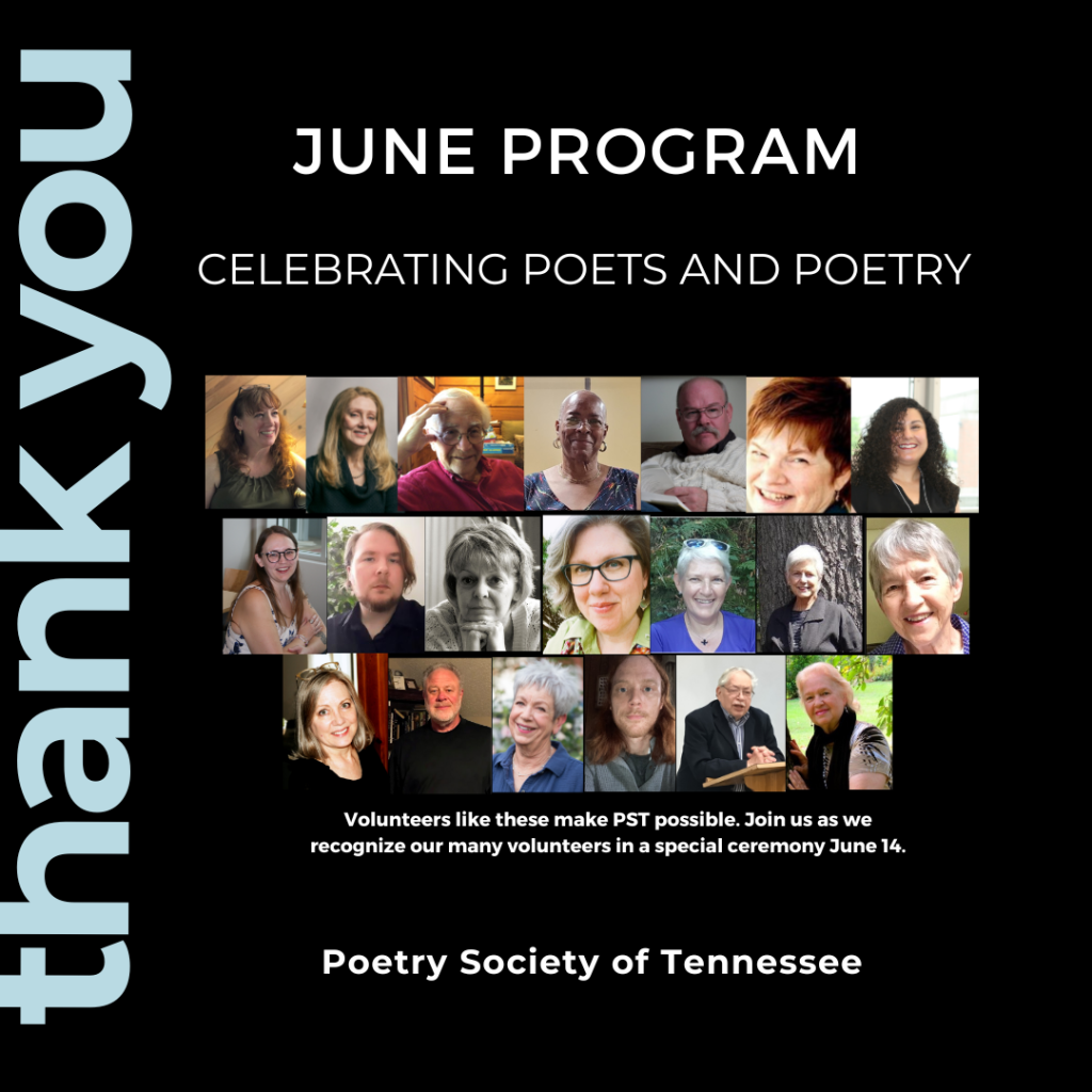 This program will be presented during our upcoming member meeting, to be held June 14 from 2:00 – 4:00 pm Eastern / 1:00 – 3:00 pm Central via Zoom. Members will be provided a link a few days prior. If you are interested in learning more about PST, check out our website. If you’d like to attend our meeting as a guest, contact us at poetrytennessee@gmail.com.